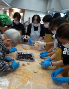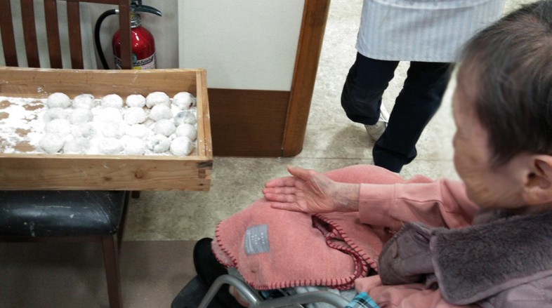 つきたてのおもちを職員と利用者様で丸め、きなこもちや