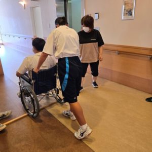コロナ禍もあり、本当に久し振りに雄新中学校の生徒さんが、「職場体験学習」 に来られました。 通学で前を通る事はあってもなかなか馴染みのない施設に来られて、皆さん緊張の 面持ちで高齢者の事や普段の介助の様子、車いすの操作などを体験して頂きました。